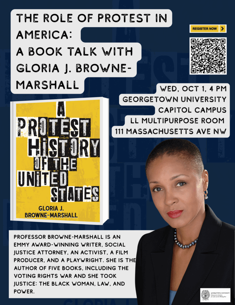 Protest is a staple of life in Washington, from debates over slavery in the early days of the republic to contemporary clashes with ICE and the National Guard in our neighborhoods. The Kalmanovitz Initiative invites you to join Gloria J. Browne-Marshall (professor of law and Africana studies, John Jay College, CUNY) in a discussion on the significance of protest in American society, with particular focus on labor rights and unions.