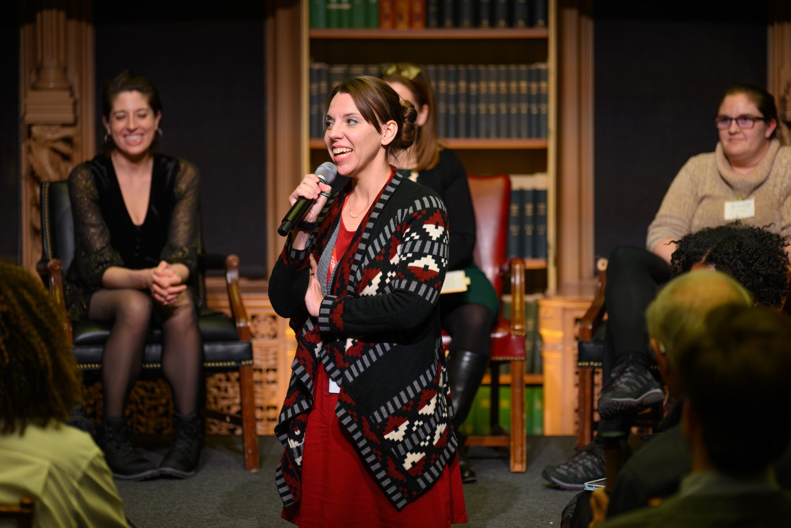 On December 11, 2025 over 200 workers, labor leaders, scholars, students and activists gathered on Georgetown’s campus in Riggs library to celebrate the Kalmanovitz’s initiative for Labor and the Working Poor’s Sweet 16. In what turned out to be a labor movement reunion, past and present KI associates and supporters packed the room to hear a panel discussion reflecting on the impact of the Initiative. Lane Windham moderated a panel made up of union leaders and student activists including Paris Jones (Associate Director for Education and Leadership Training for AFSCME), Mary Catherine Ricker (Executive Director of the Albert Shanker Institute), Nick Wertsch (Associate Director of Workplace Justice for DEMOS), and Fiona Naughton (SFS’26 and student activist with the Coalition for Workers’ Rights).